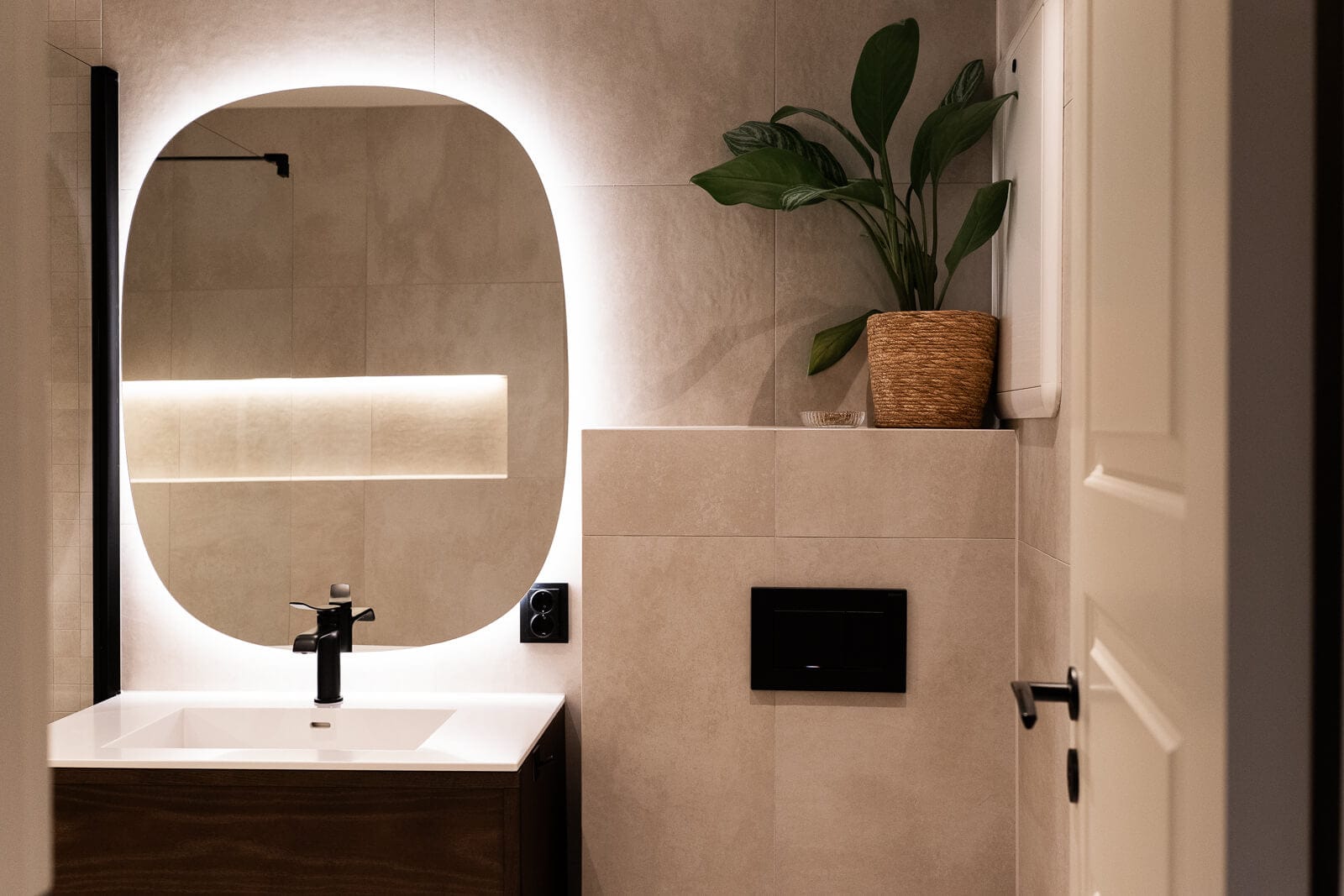 Ingrid ville bort fra kalde flater. Valget falt på beige fliser og mørkt tre som base. Svarte detaljer på armatur, speilramme og trykknapp binder rommet sammen og skaper helhet.