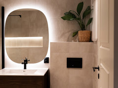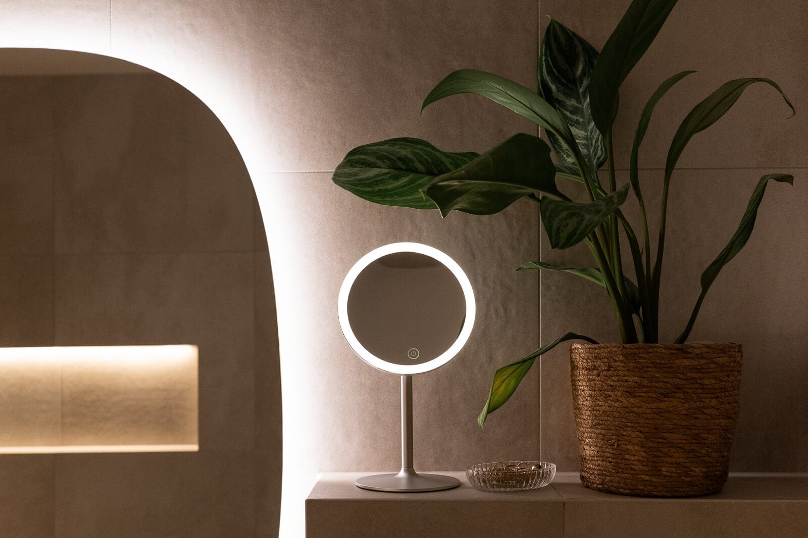 Uten dagslys må lyset planlegges. Ingrid valgte speil med integrert lys - klart om morgenen, mykt og behagelig om kvelden. I dusjen bygget hun inn en nisje med LED. Der får flaskene plass i veggen i stedet for på gulvet, og du får både orden og en spaaktig, lun stemning.