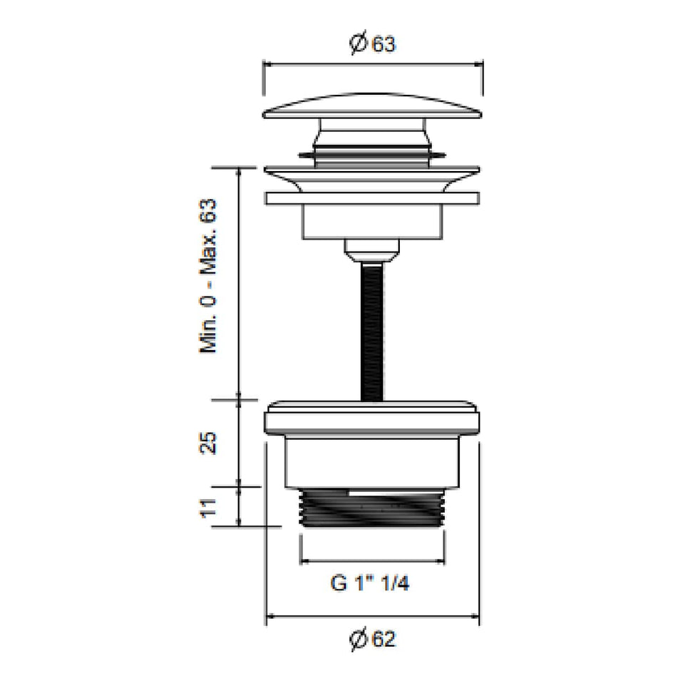 Universal klikkventil med justeringsskrue. Standard mål, Ø63 mm hette og G1 1/4" gjenge mot vannlås. Passer alle baderomsservanter, inkludert toppmonterte servanter til benkeplate.
