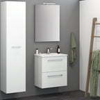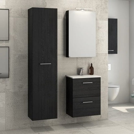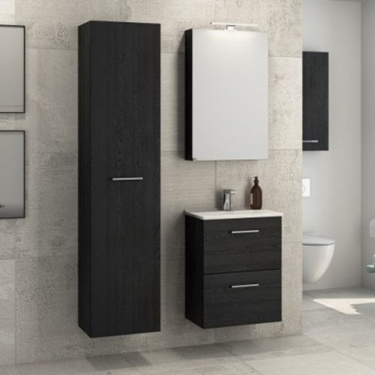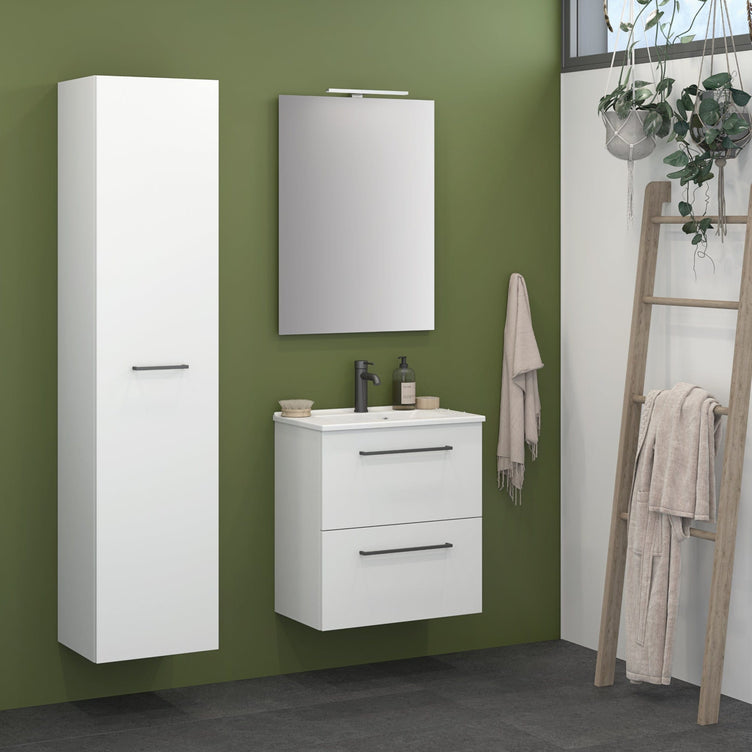 16 mm melaminbelagt sponplate med ABS-kantbånd og PU-lim. Skapene leveres sammensatt inkl. opphengsbeslag for montering på veggen samt hvit bakplate på hvite skap og alu-farget på skap i sort eik. Alu-farget hylle og bunn i servantskapet uansett farge.