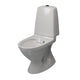 Gulvstående toalett med skjult S-lås - avløp til gulv. Toalett monteres med skruer eller lim, har rimless åpen spylekant og kondensfri sisterne. Forkrommet spyleknapp med dobbelspyling 3/6 liter.