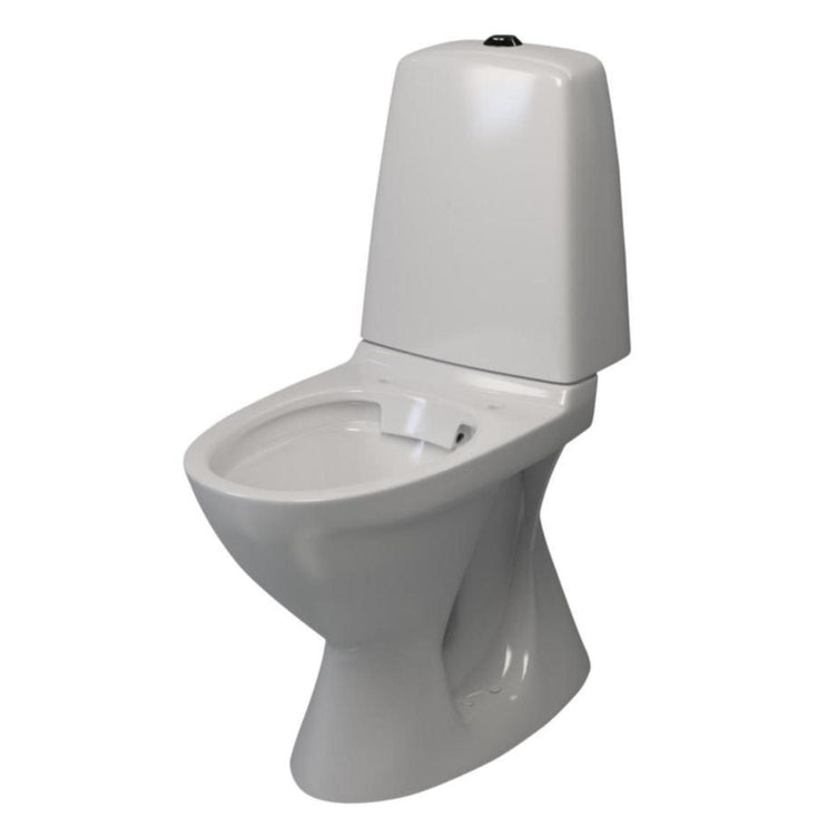 Gulvstående toalett med skjult S-lås (avløp til gulv) for skruer. Den helstøpte foten forenkler rengjøring. Rimless åpen spylekant og kondensfri sisterne. Forkrommet spyleknapp med dobbelspyling 3/6 liter. Ekstra høy modell med 46 cm sittehøyde, noe som gjør det svært enkelt å reise seg opp igjen etter bruk.