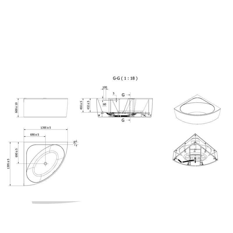 Dette er et ROMSLIG hjørnebadekar i 140 × 140 × 60 cm, laget i akryl og glassfiber med rustfritt stålfeste, med glatt og blank hvit overflate (NCS S0300‑N). Det er helstøpt og har ikke avtagbart frontpanel.