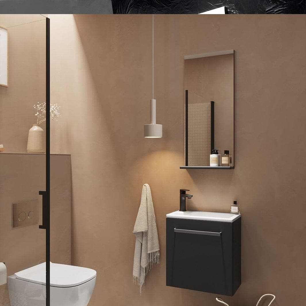 Niza møbelsett gir et ryddig inntrykk på det lille toalettrommmet. Settet inneholder speil med en liten hylle, servant i resin (kunstmarmor), og underskap med farge både på dør og sidevegger. Kranhullet er bak på venstre side av servanten. Døren åpnes fra venstre side.