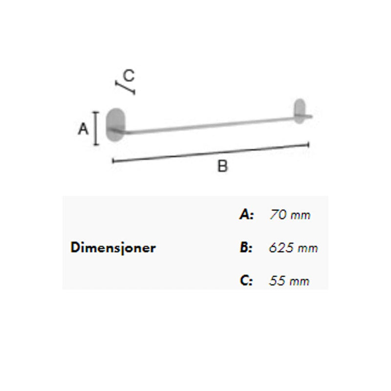 BESLAGSBODEN enkel håndklestang. Børstet rustfritt stål (B1036), krom (BK1036) eller svart (BB1036). Selvklebende. cc 580 mm. Total lengde 625 mm.