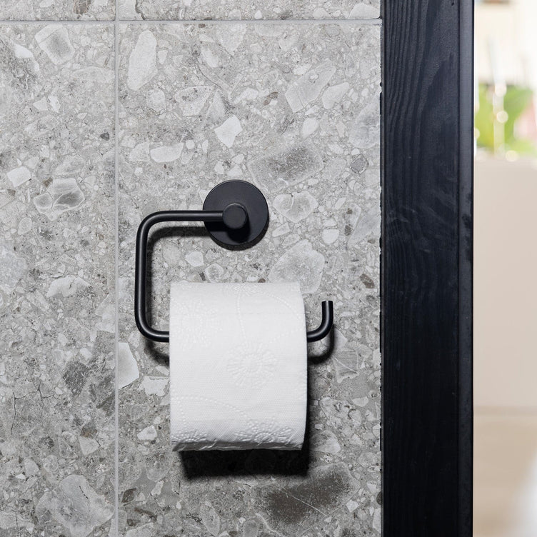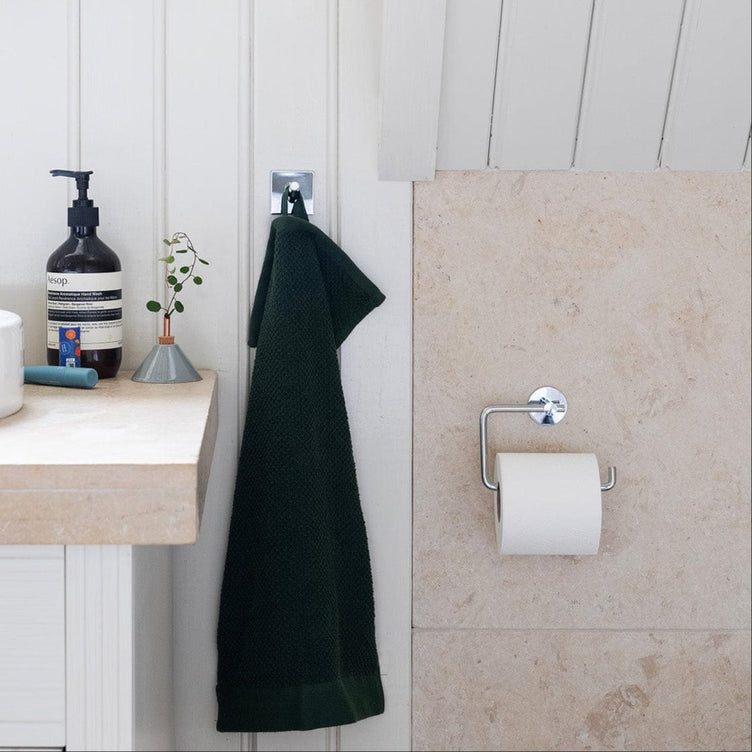 BESLAGSBODEN toalettpapirholder. Krom (BK1130), børstet krom (B1130) eller svart matt (BB1130). Selvklebende.