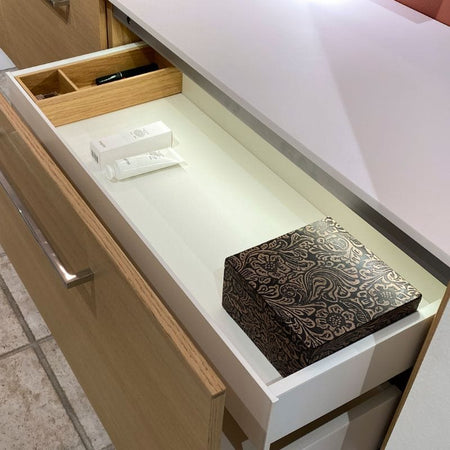 Innvendig skuff i 40 cm høye servantskap med en skuff. Ekstra romdelere og lokk kan kjøpes som tilvalg.