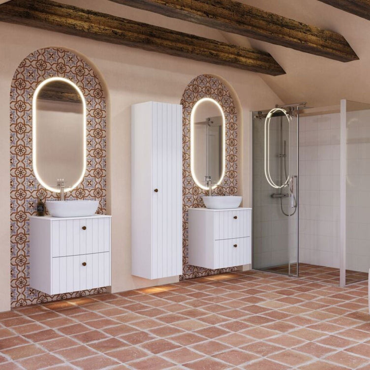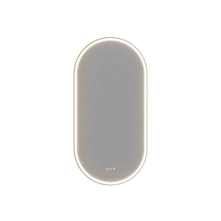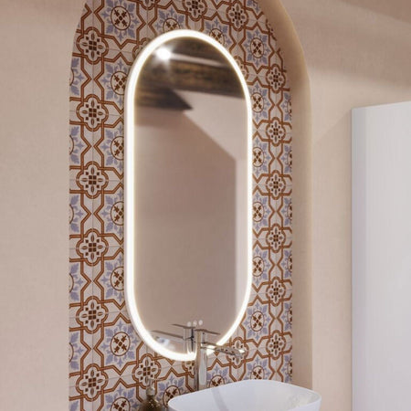Hoop ovalt speil gir et stilfullt og moderne uttrykk med sin unike svevende ramme. Den buede innerammen leder lyset jevnt fremover og skaper et mykt, diffust lys som gir behagelig belysning uten å blende. Speilet er utstyrt med lysstyring, slik at du enkelt kan justere lysstyrken etter behov, enten det er for sminke eller en avslappende atmosfære.