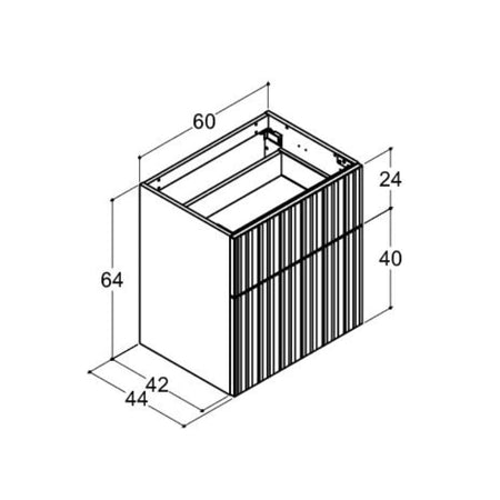 Skap et stilfullt bad med skapet som har 2 skuffer og en høyde på 64 cm. Den høye bunnskuffen gir deg rikelig med plass til oppbevaring av badeværelsesartiklene dine, mens den riflete fronten tilfører en moderne og unik detalj til designet. Disse skapene kan brukes for seg selv eller kombineres med et servantskap samt en benkeplate med oppstående vask for en spennende asymmetrisk løsning.