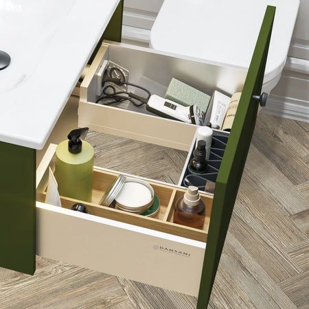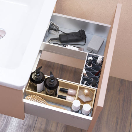 LED-lyset gir optimal belysning i skuffen, slik at du raskt finner det du trenger, selv tidlig om morgenen. Slipp bryet med ledninger og skjøteledninger, og skap en mer organisert og moderne baderomsopplevelse, der alt er innen rekkevidde – uten synlige ledninger som forstyrrer estetikken din.