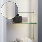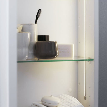 Et ryddig bad starter ofte med velorganisert oppbevaring, og derfor er det så viktig med innvendig belysning i skapene. Med innvendig belysning kan du se nøyaktig hva som står i hyllene i skapet. Lyset er plassert på motsatt side av hengslene, noe som gir deg god oversikt og en følelse av luksus og velvære på badet. Lyset er plassert på motsatt side av hengslene, noe som gir deg god oversikt og en følelse av luksus og velvære på badet.