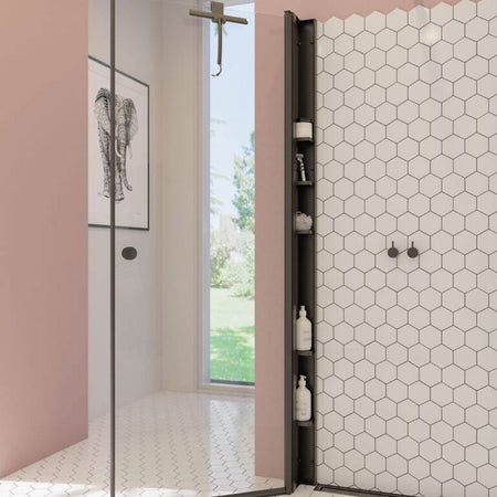 NB! Velg et dusjhjørne som er 10 cm smalere på den ene siden for å få plass til Tower hyllen. F.eks. ønsker du et 90x90cm hjørne, velger du 80x90cm + Tower dusjoppbevaring.