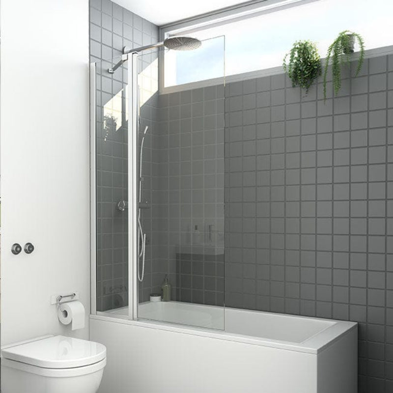 Badekarveggen har 6 mm klart herdet sikkerhetsglass med EasyCare behandling og sateng (krom) profiler. Dusjveggen er to-delt med et fastfelt og en svingdør. Veggen er justerbar +/-2cm, 95-97cm. Høyde 155 cm. Glassdøren kan lukkes inn mot armaturen slik at avskjermingen tar minst mulig plass. Støttearm er inkludert.