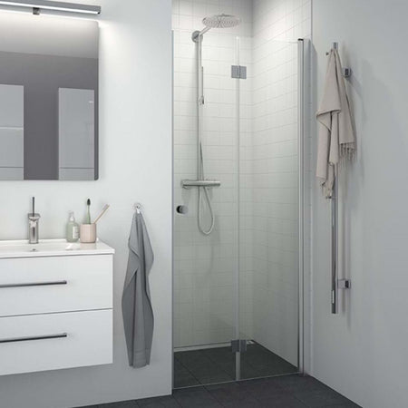 Foldedør og fastvegg - spesielt praktisk i små bad da døren ikke åpnes ut mot rommet, samtidig med at fastveggen gjør det mulig å utnytte plassen tett opp mot dusjløsningen til for eksempel baderomsinnredning.