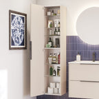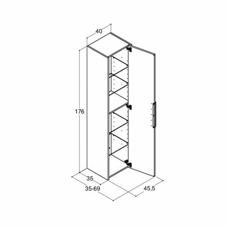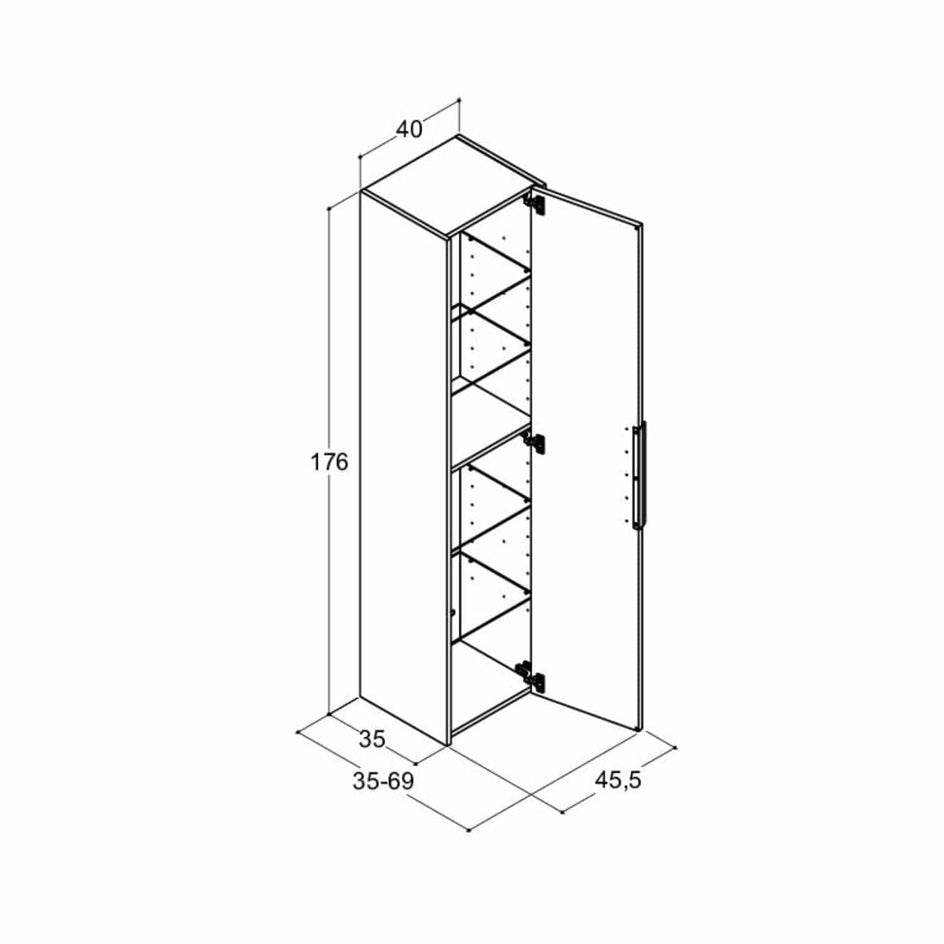 Dette høyskapet er designet for fleksibilitet og romslighet. Med en vendbar dør kan du tilpasse skapet til innredningen din, uansett hvilken retning du foretrekker. Innvendig finner du en solid trehylle og fire flyttbare glasshyller, noe som gir deg mange oppbevaringsmuligheter. Skapet er tilgjengelig i hvitt, sandfarget eller lyseblått, og håndtaket er montert slik at skapet er klart til bruk.