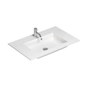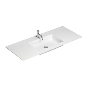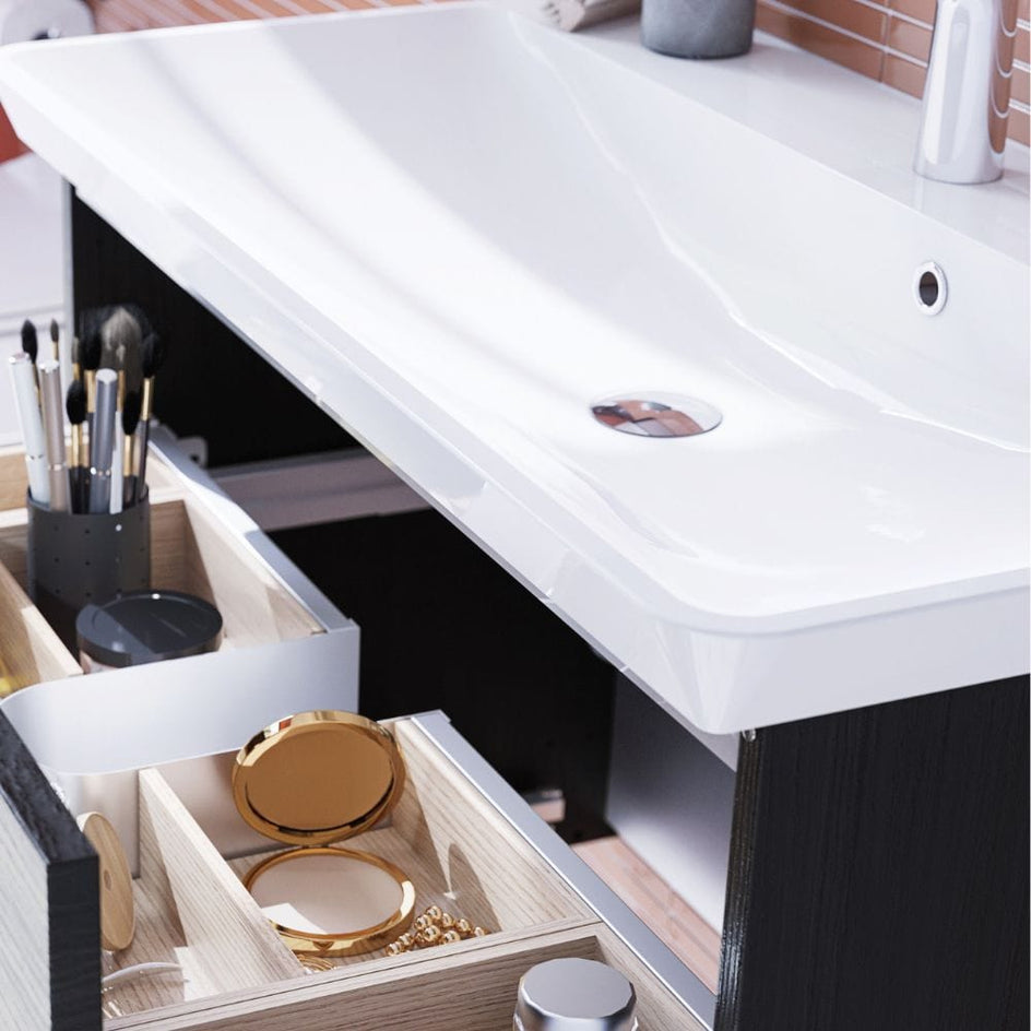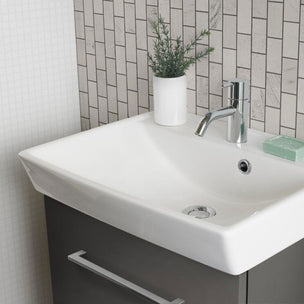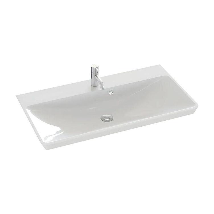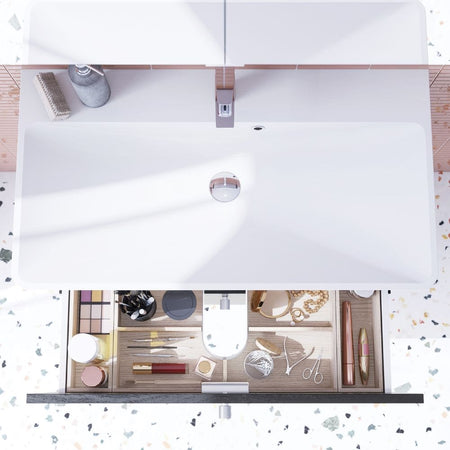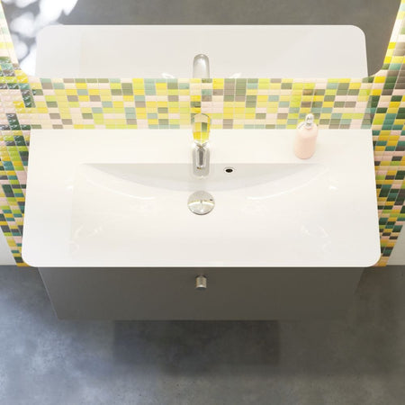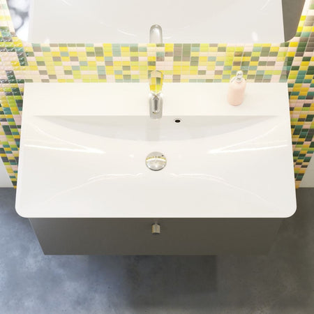 Vasken sprer seg elegant over møbelet, og med sitt skarpt definerte basseng til kant utnyttes plassen optimalt – både med et romslig basseng og et praktisk og flatt avsetningsområde bak. For å sikre at vasken din beholder sitt flotte utseende i mange år, er den utstyrt med en overflate som er mye hardere enn tidligere støpemarmorvasker.