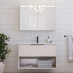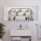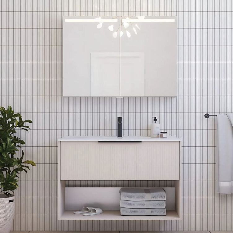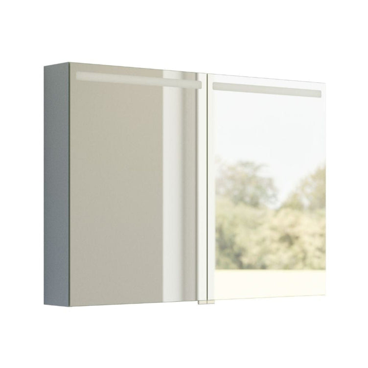 Speilskap med LED lysfelt øverst gir optimal belysning når du skal se deg selv i speilet, og de dobbelte speildørene gir flere muligheter for å speile seg i forskjellige vinkler.