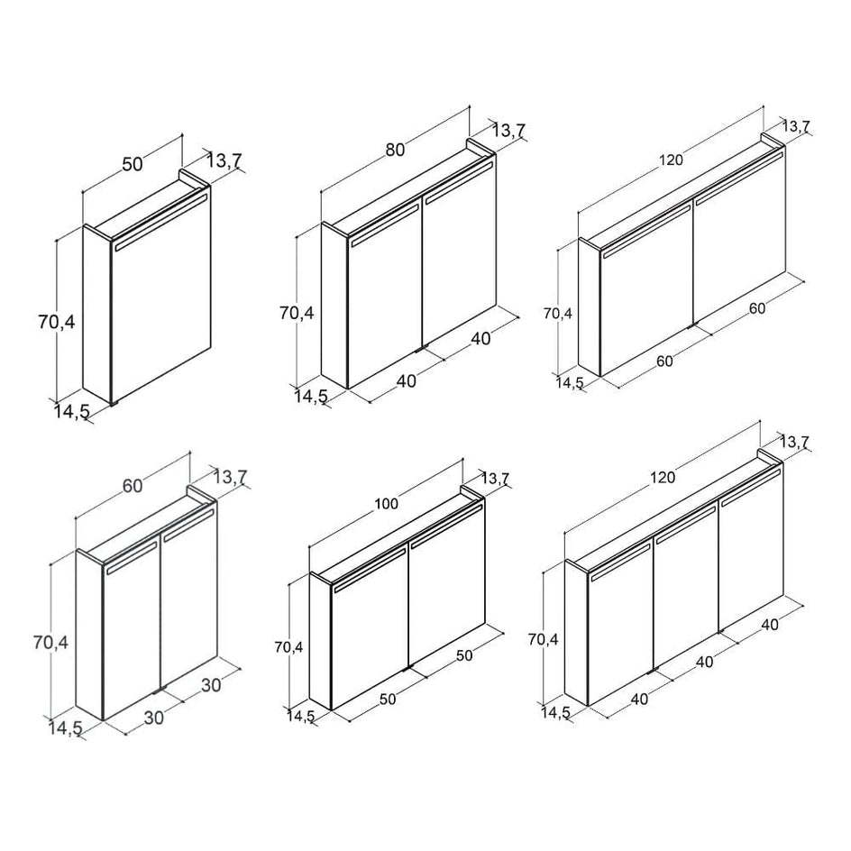 Det minste speilskapet har 1 stk. 50cm høyrehengslet dør. De andre størrelsene B60-120cm har 2 dører og B120cm 3 dører (30+30cm / 40+40cm / 50+50cm/ 60+60cm/40+40+40cm).