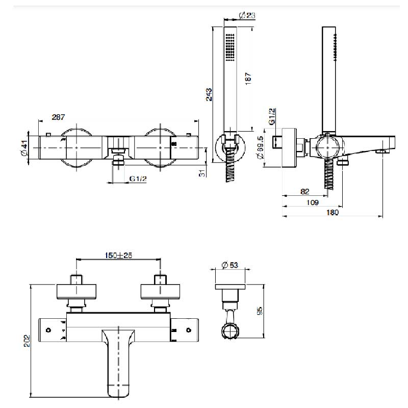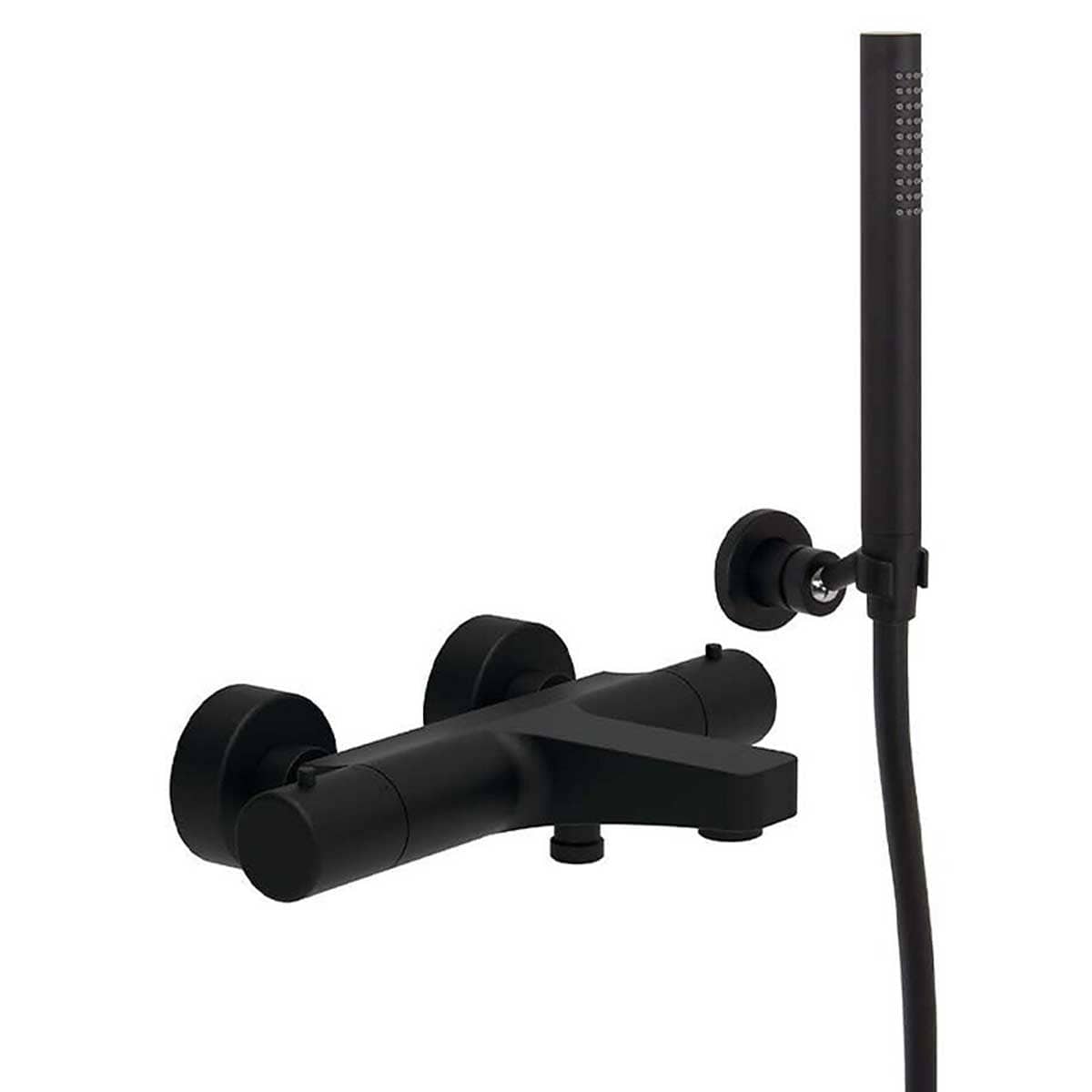 Komplett vegghengt blandebatteri for badekar med fylletut, dusjslange, veggfeste og dusjhode.