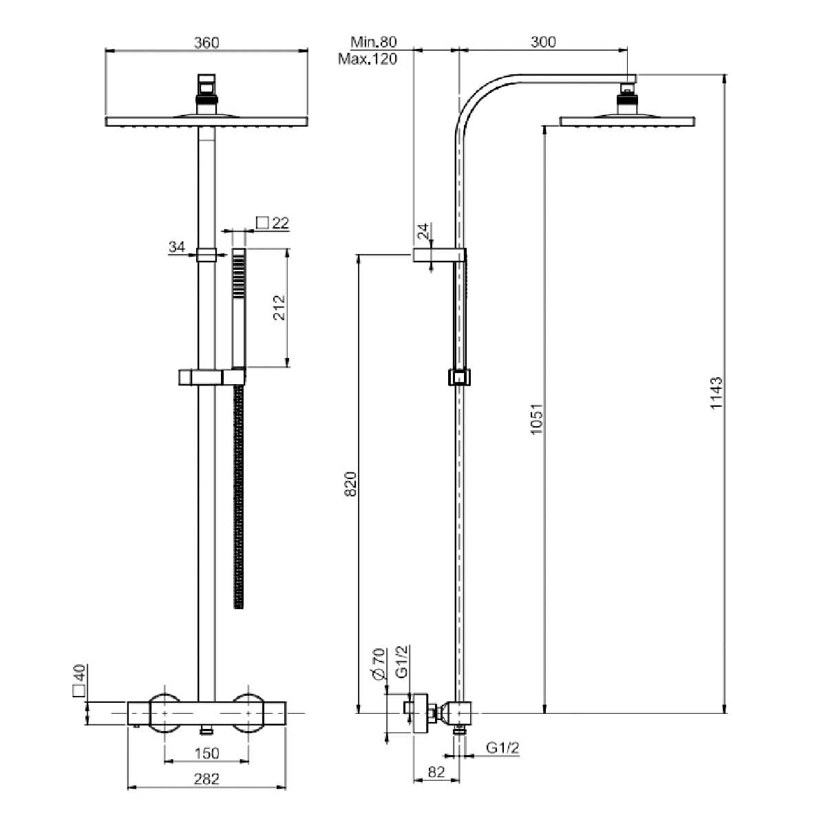 Firkantet tubehånddusj - en innstilling på strålen. Vender i termostat. Justerbar høyde på stang ved montering 1034-1400 mm. Krom eller svart matt overflate.