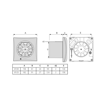 Ø100mm Ø125mm Ytelse Luftmengde frittblåsende 97 m³/h 185 m³/h Maks trykkfall 43 Pa 73 Pa Strøm Merkespenning 240 V Frekvens 50 Hz IP-klasse IP34 Energiforbruk 7.5 W 17.0 W Strømforbruk 0.049 A 0.11 A IP-klasse IP45 Isolasjonsklasse II Materiale og farge Farge Hvit/Svart Materiale UV-stabilisert ABS plast Lyd ydtrykk dB(A) 3 m 25 dB 32 dB Installasjon Plassering Vegg Vegg/tak Omgivelsestemperatur 1 - 40 °C Mål og vekt Bredde (mm) 158 mm 182 mm Høyde (mm) 158 mm 182 mm Dybde (mm) 107 mm 118 mm Vekt 0.55 kg 0.78 kg Kanaltilkobling (Ø) 100 mm 125 mm -