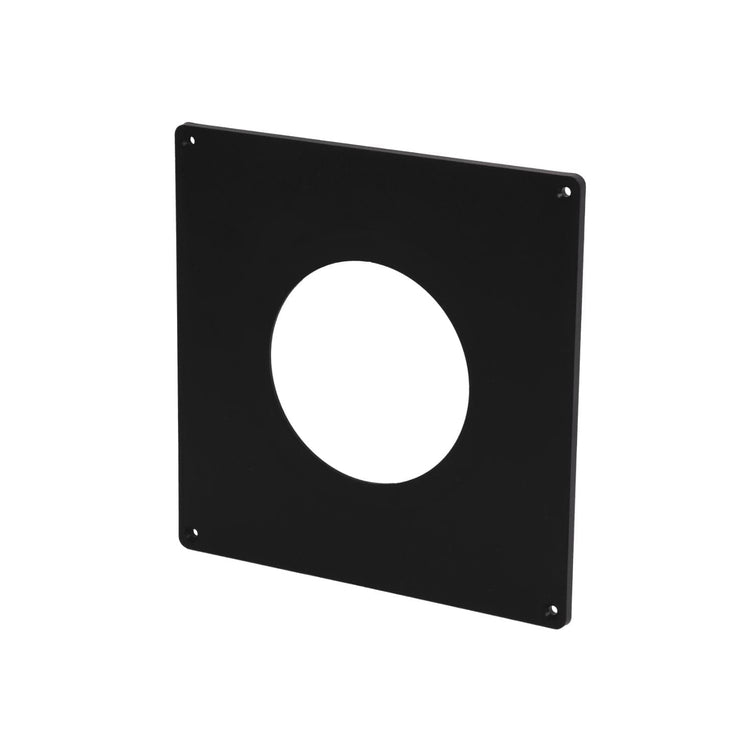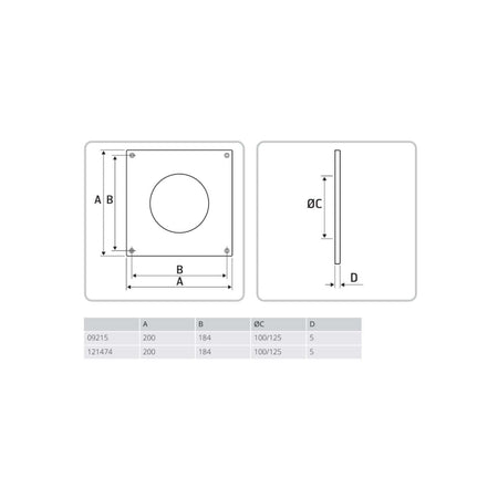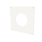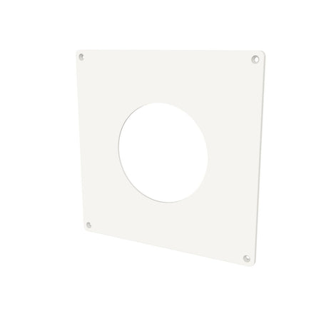 Dekkplate 200x200 mm. Brukes når viften ikke dekker kanalens åpning. Viften eller ventilen skrus fast i dekkplata som festes i veggen. Tilpasset vifter og ventiler både i Ø100 mm og Ø125 mm.