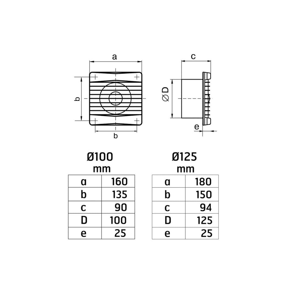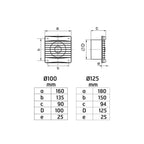 Ø100mm Ø125mm Ytelse Viftehastighet, maks 2300 r/min 2400 r/min Luftmengde frittblåsende 85 m³/h 185 m³/h Strøm Merkespenning 230 V Frekvens 50 Hz IP-klasse IP34 Lyd Lydnivå dB(A) 34 dB 39 dB Mål og vekt Bredde (mm) 160 mm 180 mm Høyde (mm) 160 mm 180 mm Dybde (mm) 90 mm 94 mm Vekt 0.46 kg 0.59 kg Kanaltilkobling (Ø) 100 mm 125 mm -