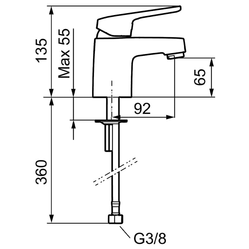 - Byggehøyde, undersiden av kranutløp: 65 mm