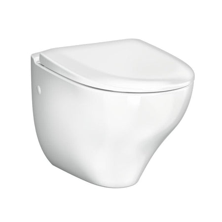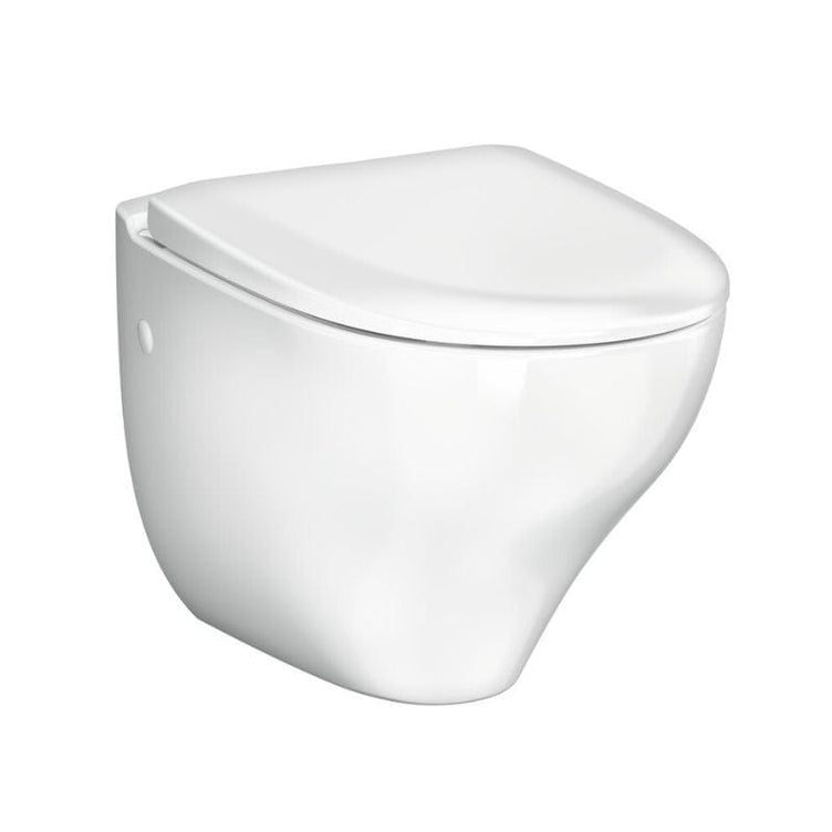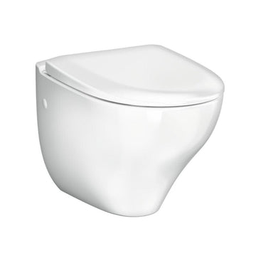 Vegghengt toalett med Soft Close og Quick Release toalettsete (hvit hardplast), åpen spylekant (rimless) og organisk design med "enkelt-å-rengjøre" overflater. Produsert i hygienisk, holdbart og tettsintret sanitærporselen.