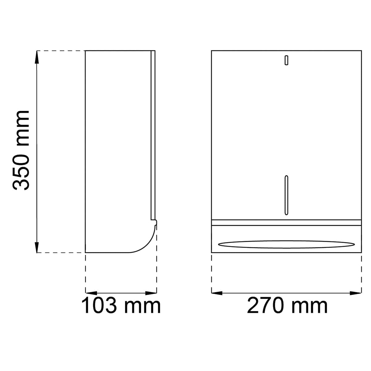 Tørkepapirdispenser av metall Ekstra nøkkel finnes som tilbehør. Høyde 350 mm, bredde 270 mm. For bruk på toalettet, badet etc.