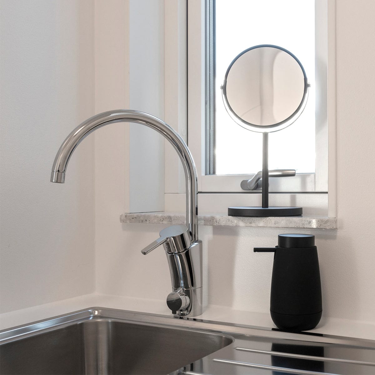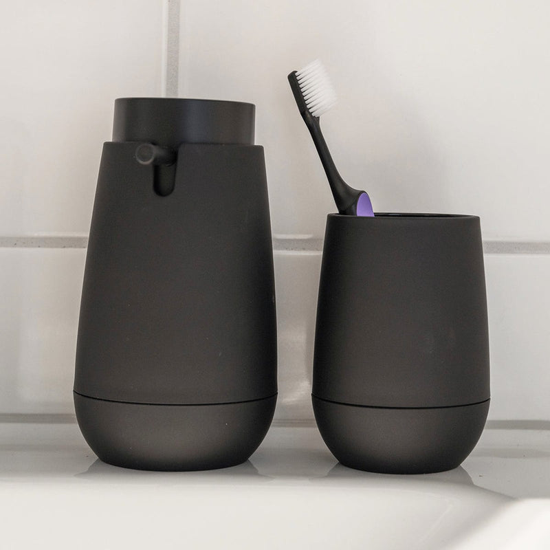 Moderne og stilren såpedispenser i plast. Vakker interiørdetalj på bad eller kjøkken. Gummiert overflate i matt sort finish. Diameter 91 mm. Høyde 161 mm.