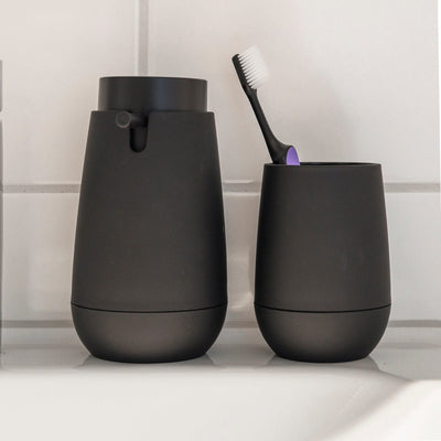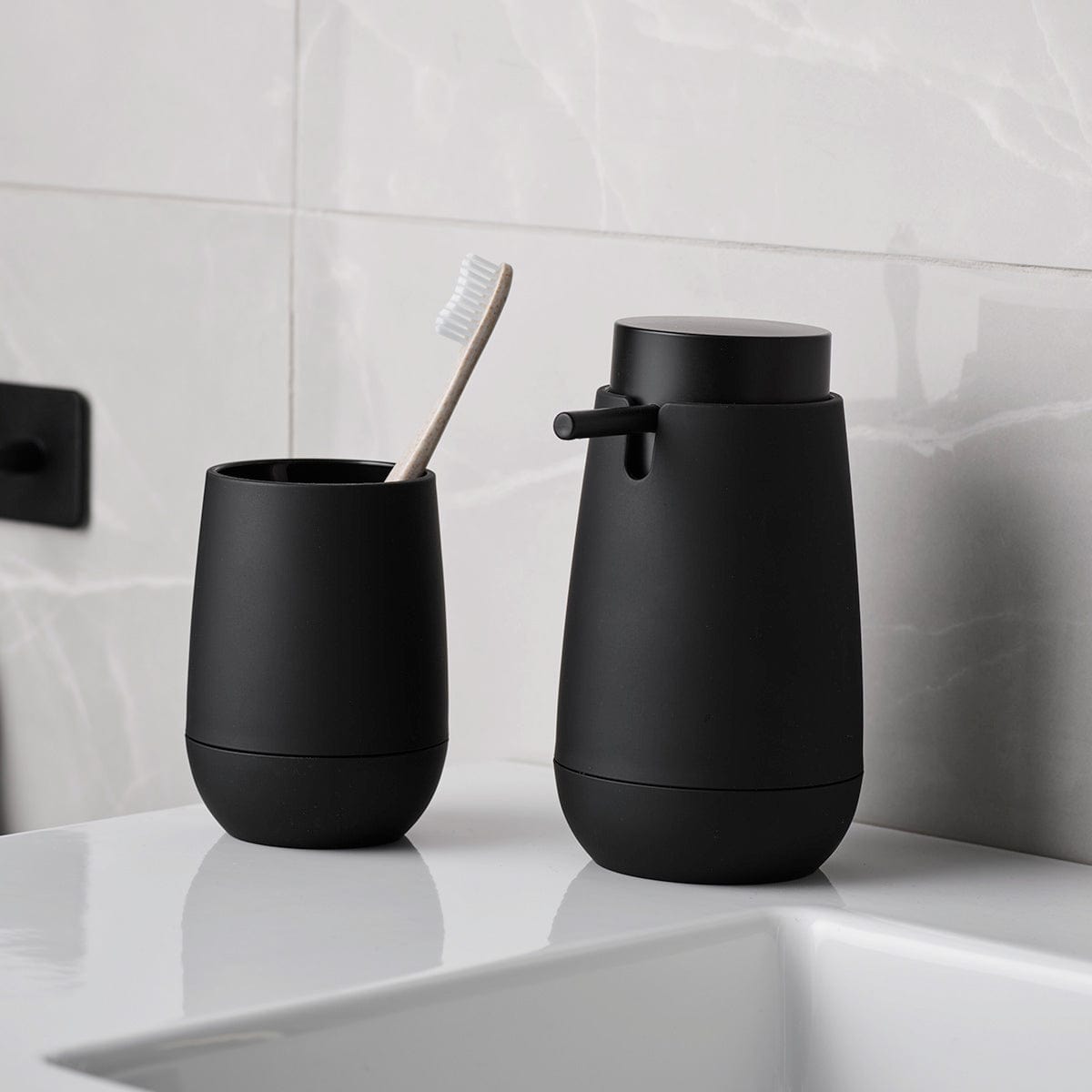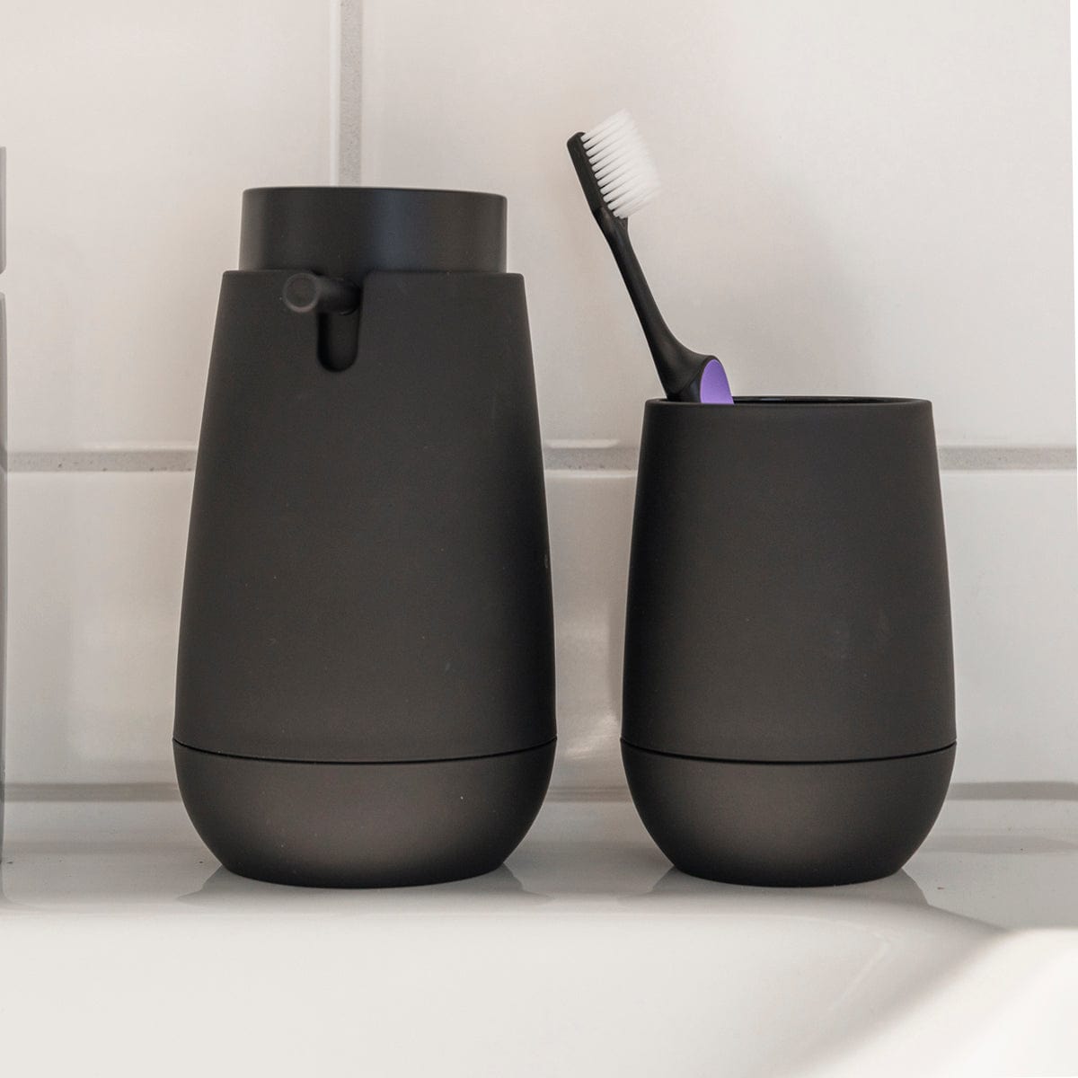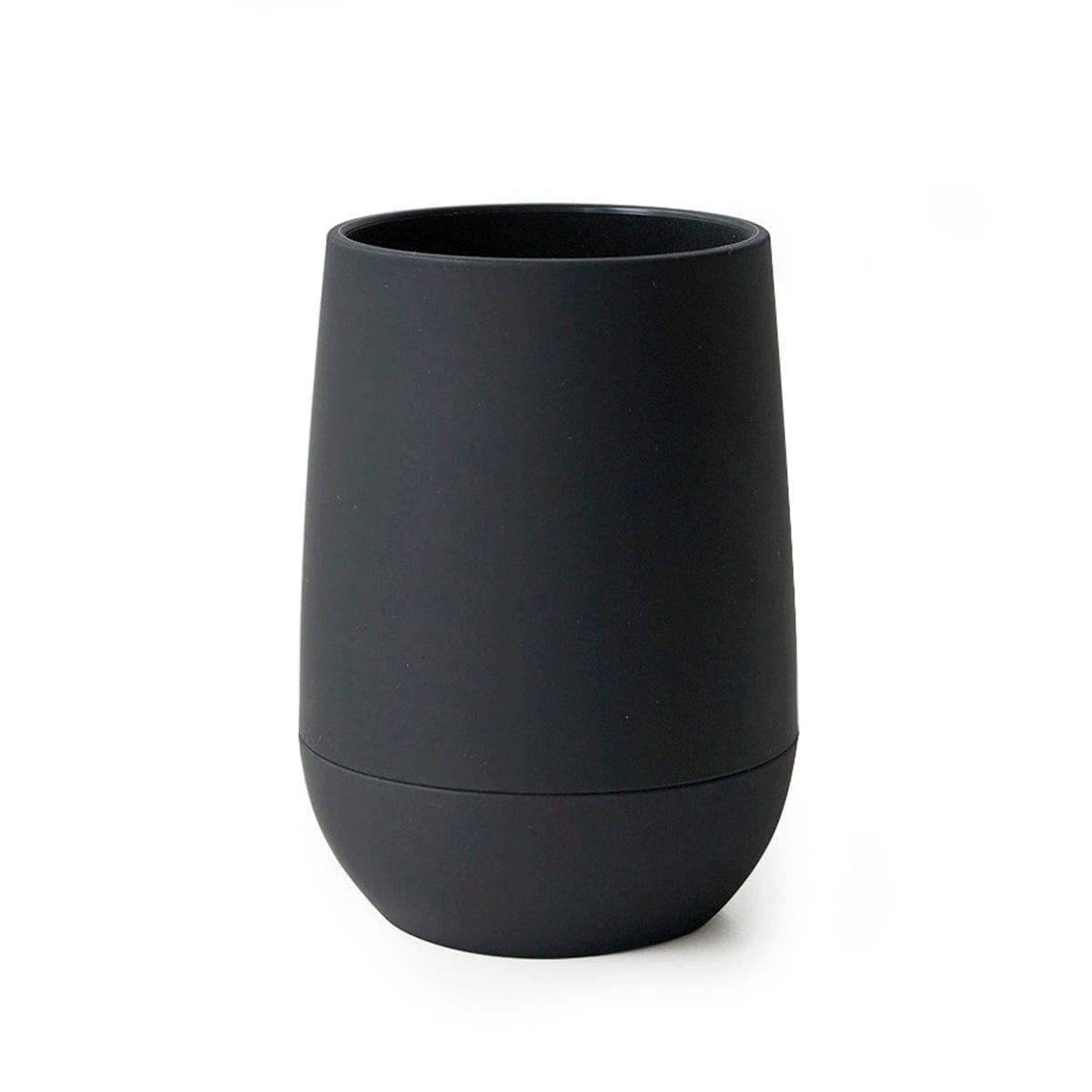 Moderne og stilig tannbørsteholder av plast. Flott interiørdetalj på badet. Gummiert overflate i matt sort finish. Diameter 80 mm. Høyde 110 mm.