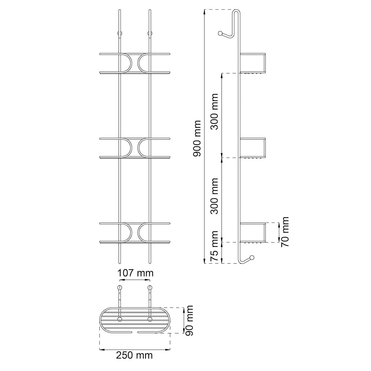 Dusjhylle av rustfritt stål. Tre kurver for flasker etc. Henges enkelt over dusjveggen for en fuktsikker installasjon. 3 hyller med 2 kroker på nederste hylle og 2 kroker som kan brukes til håndklær på utsiden av dusjveggen. 5 års rustbeskyttelsesgaranti.