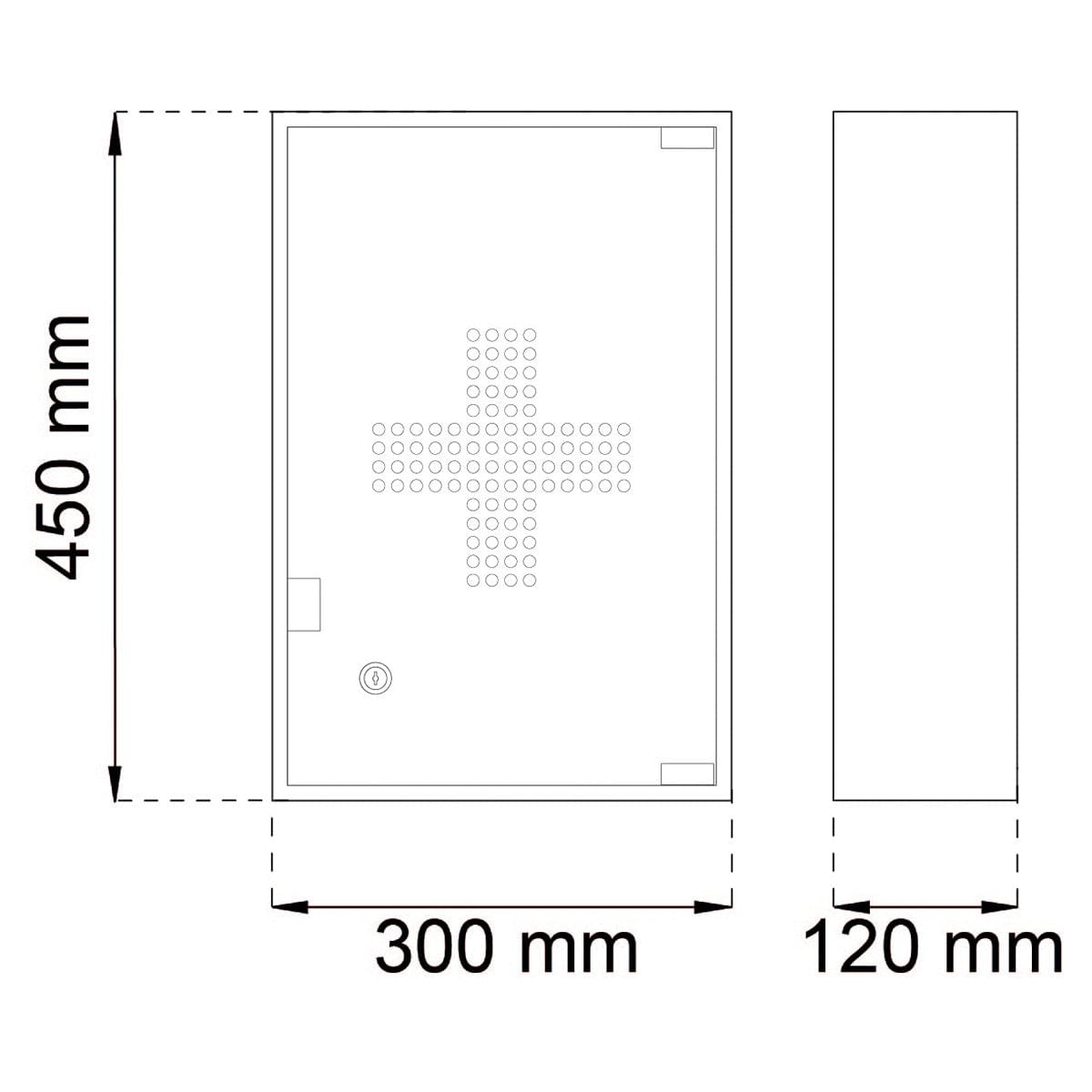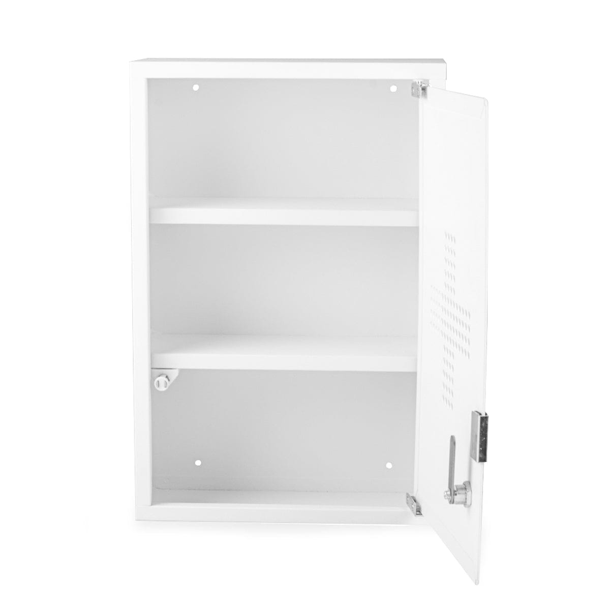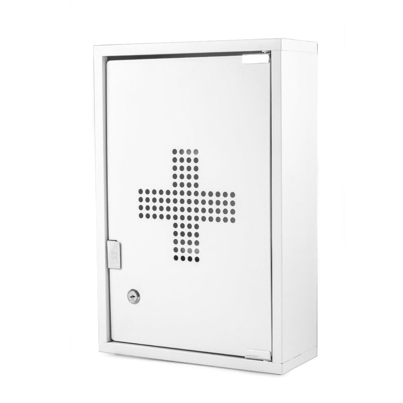 Låsbart medisinskap av pulverlakkert elforsinket stål. Skapet har to hyller til oppbevaring av medisiner, plaster etc. Leveres med to nøkler. Skruer for montering følger ikke med.
