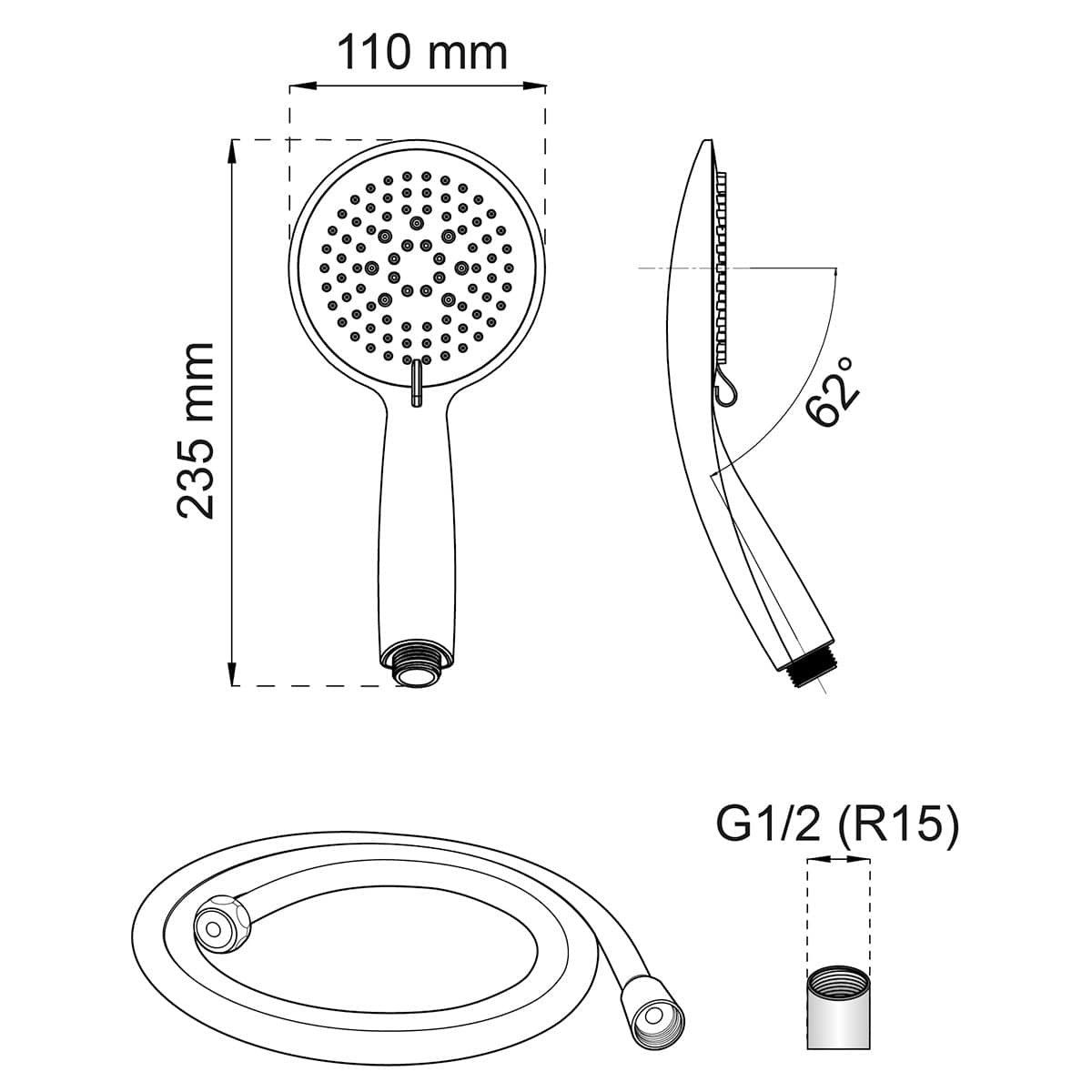 Dusjpakke med hånddusj og 1,5 meter dusjslange. Hånddusjen har én stråletype og dusjhode med en diameter på 85 mm. Med anti-kalk funksjon. Rubber Clean-gummi på dusjhodet gjør det enkelt å fjerne kalk. Passer alle blandebatterier og dusjer, G1/2. Bruk de medfølgende sorte pakningene ved montering. Skal ikke stå under konstant trykk. Vannsparefunksjon, 6,5 liter/minutt.