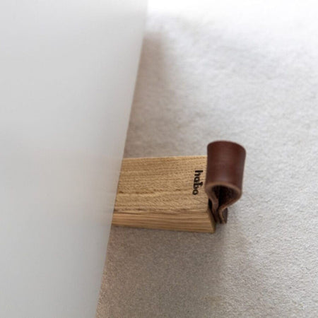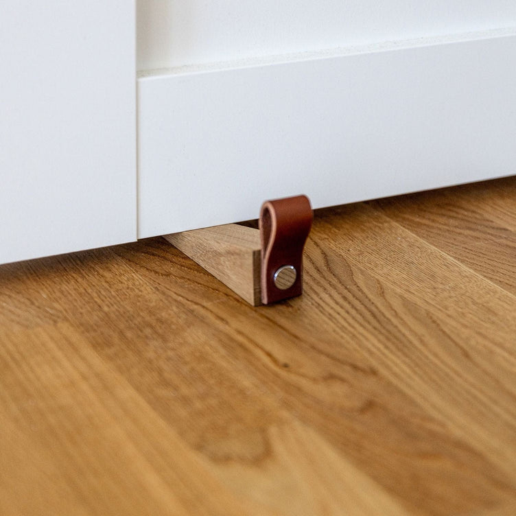Dørkile av oljet eik, med hempe av naturlig garvet skinn fra Tärnsjö garveri. Moderne og stilig kile som holder døren på plass.