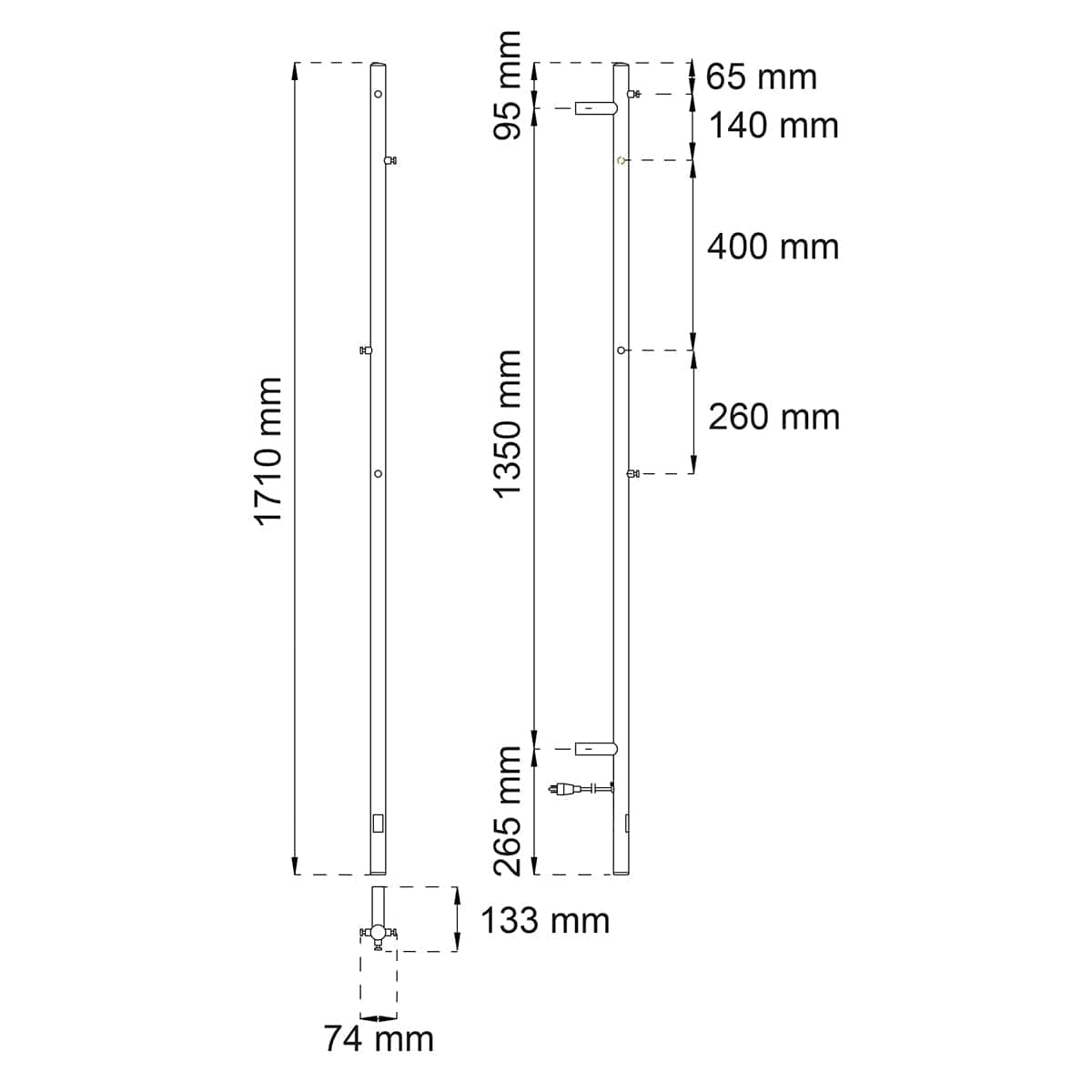 Håndkletørker i rustfritt stål med fire kroker. Stilig og moderne design. Perfekt for trange steder. Med LED-belyst av/på-knapp nederst for et diskret utseende. Reduser strømforbruket med berørbar timer, 1-8 timer. Justerbar temperatur, 30-70 grader. Den kan også stilles inn i konstant modus. Effekt 45 W / 230 V. IP-klasse 44. Leveres med støpsel. Monteringssett for skjult tilkobling av strøm selges separate.