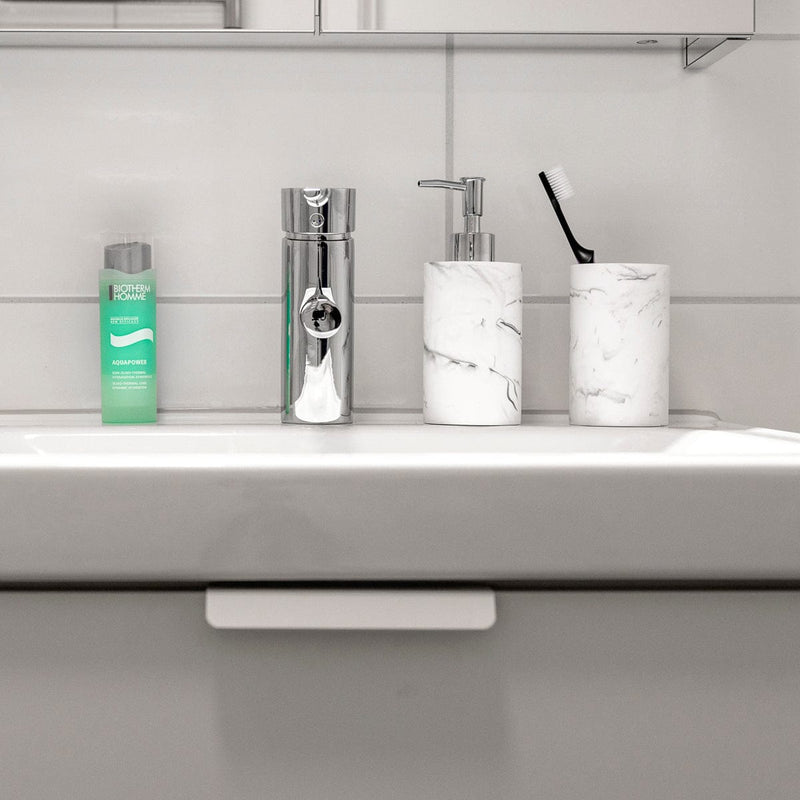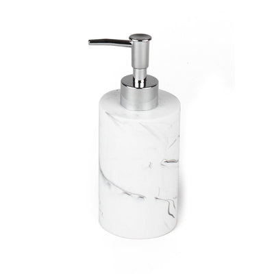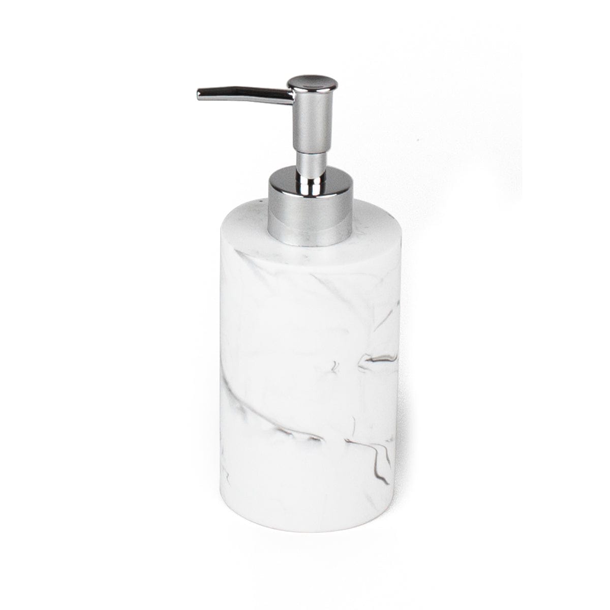 Stilren såpepumpe laget av polyresin. Med sin vakre marmorimitasjon blir den en fin interiørdetalj på badet.