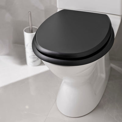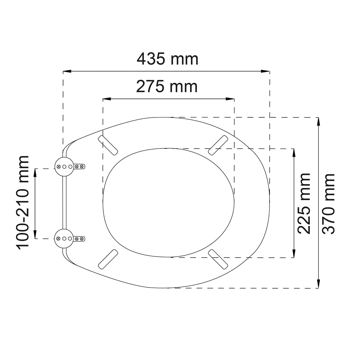 Toalettsete av resirkulerbart, FSC-merket, trefiber. Universal. Fleksible snap-on fester med cc 100-210 mm som passer til de fleste toalettseter. Festene gjør setet enkelt å montere og fjerne. Soft-Close stillegående myk lukking.