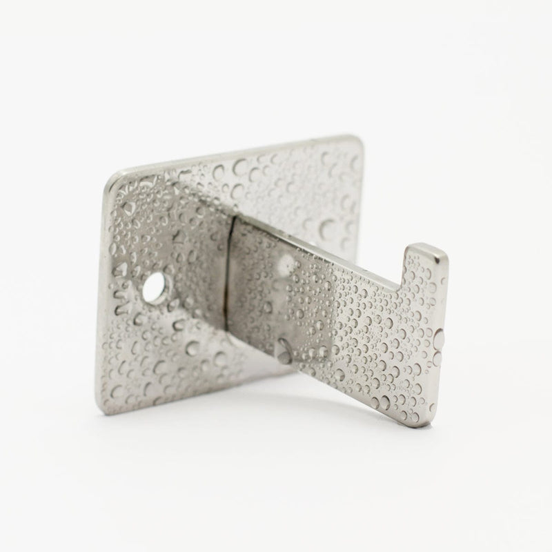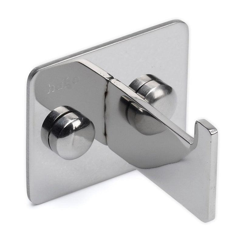 Enkel krok av polert rustfritt stål og sortlakkert stål. Skult innfesting. benyttes på kjøkkenet ol. I tillegg til å anvendes på bad, kan brukes for oppheng i garderobe, på kjøkken etc.
