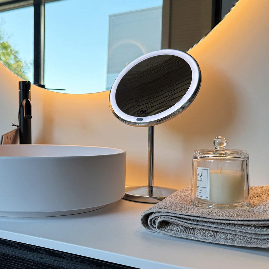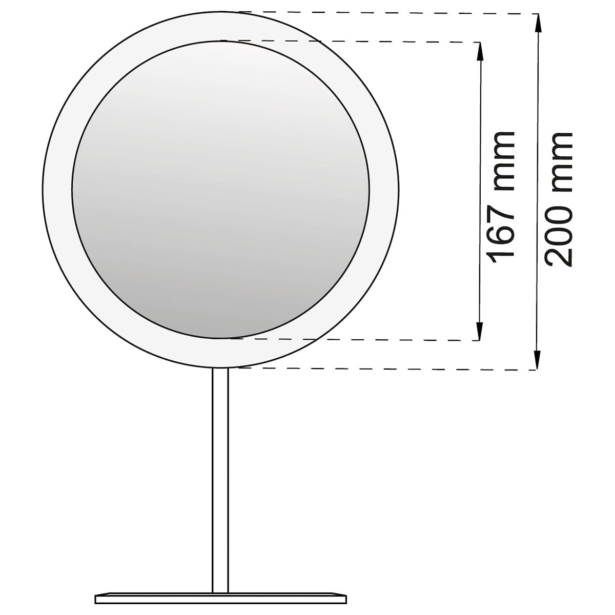 Bordspeil med 5 ganger bildeforstørrelse. Speildiameter 167 mm, med ramme 200 mm. LED-belysning i rammen som lyser opp detaljene i speilet. Belysningen drives av den medfølgende USB-kabelen eller med batterier. Batteri ikke inkludert.
