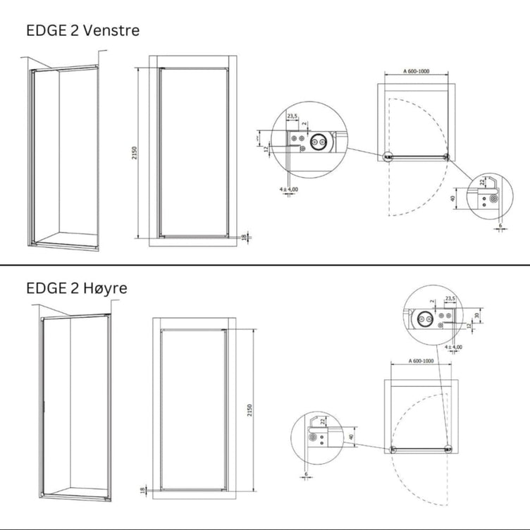 INR Dusjvegg EDGE 2 - Dusjdør i 6 mm glass med integrert grep. Måltilpasses innen angitte intervaller.