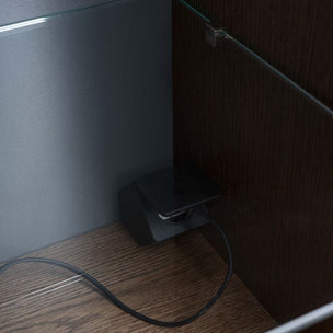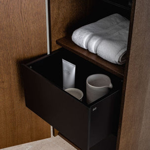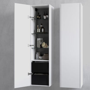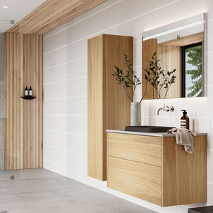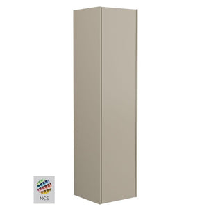 Et romslig høyskap som matcher servantskapene i møbelserien Grand Solid. Push inngår, men du kan velge annet grep i tillegg hvis du ønsker det. Ved bestilling oppgi om du ønsker døren høyre- eller venstrehengslet. Skapet er en fast hylle i tre, de øvrige i 6 mm herdet sikkerhetsglass, samtlige flyttbare. Utstyr gjerne høyskapet med stikkontakt, valgfri plassering. Flere høyskap kan plasseres inntil hverandre.