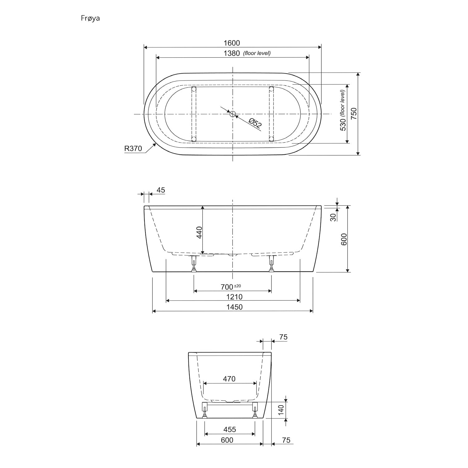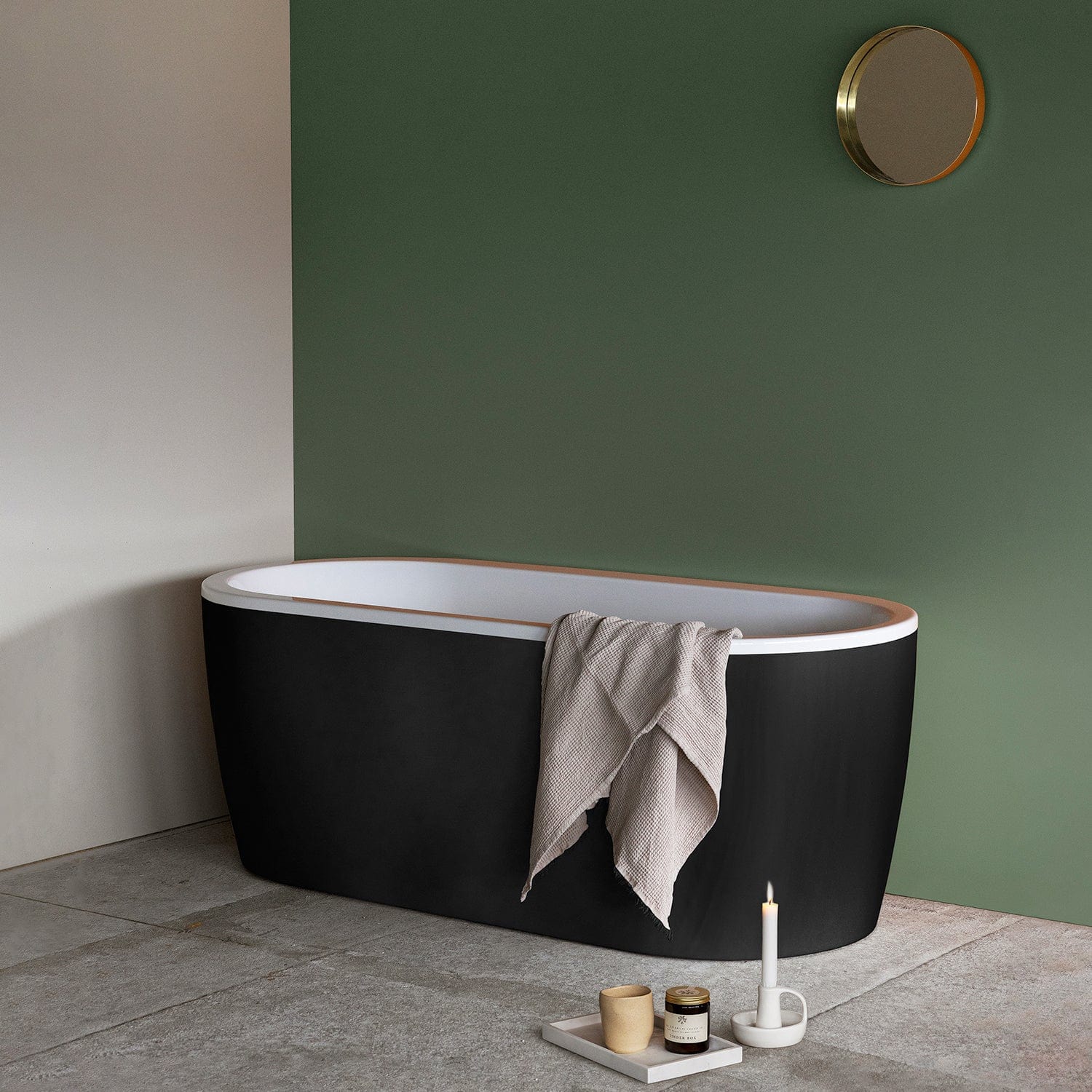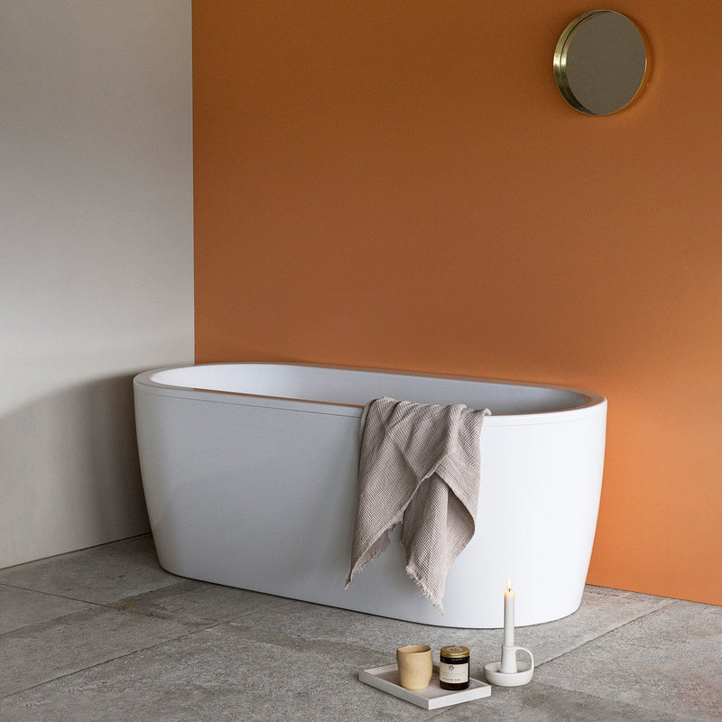 Frittstående designbadekar med helstøpt front. Støpt i ekstra tykk akryl for bedre kvalitet og stabilitet. Et luksuriøst og romslig badekar. Kan bruke både gulvmontert armatur eller vanlig karkantarmatur.