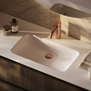 Den flate bunnen gir et stramt og rolig uttrykk, samtidig som Corian-materialet bidrar til en slitesterk og porefri overflate. Servanten produseres på bestilling.