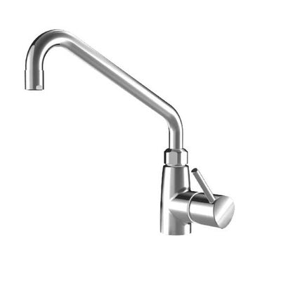 Ettgreps benkmontert blandebatteri for storkjøkkenbruk med svingradius 360°. Etthulls-gjenomføring i benk med anslutninger CU-rør 15 mm. Aramturet har kermaisk innmat for stor vannmengde. L 300 mm. Kan også leveres med ledet tut, L 750 mm eller 900 mm.