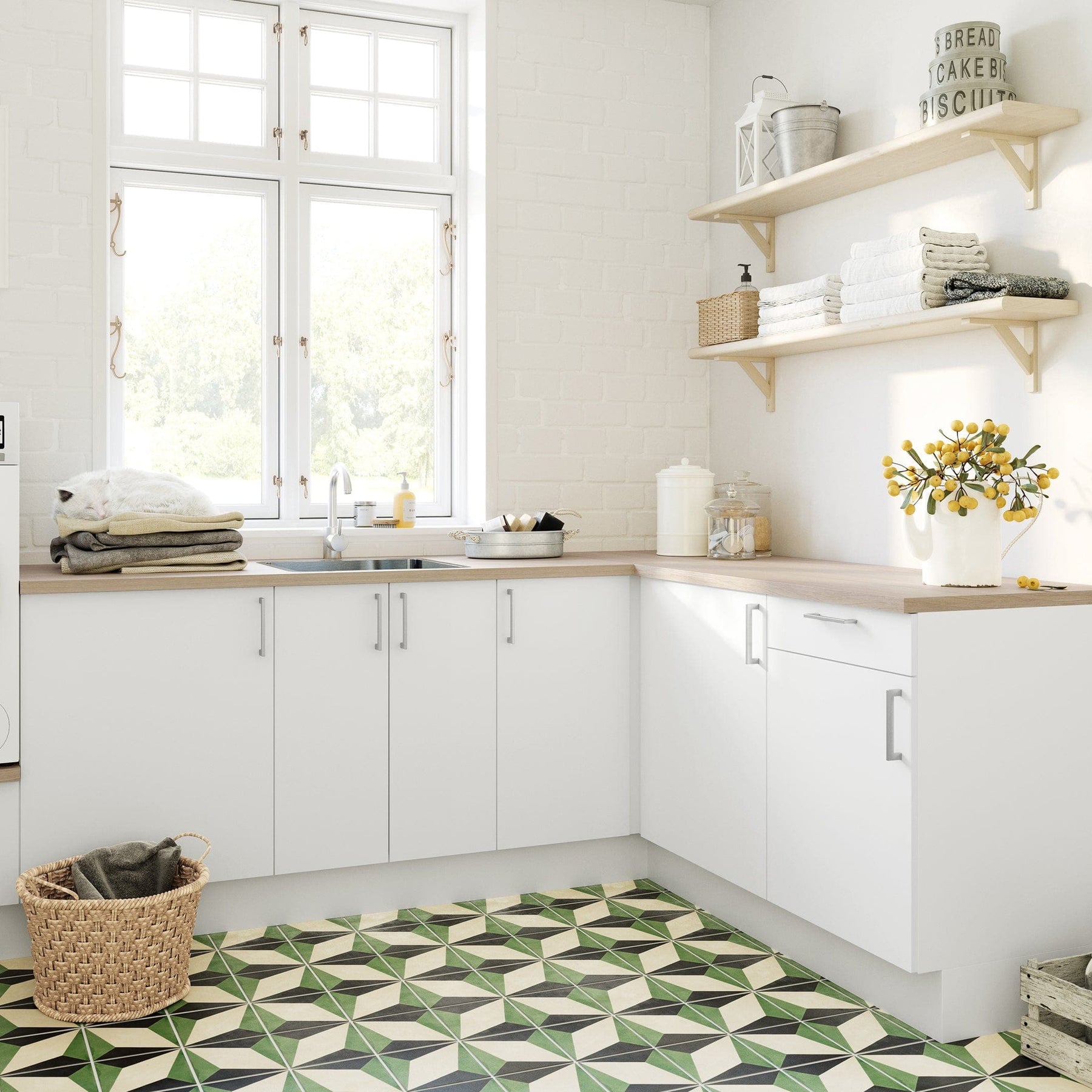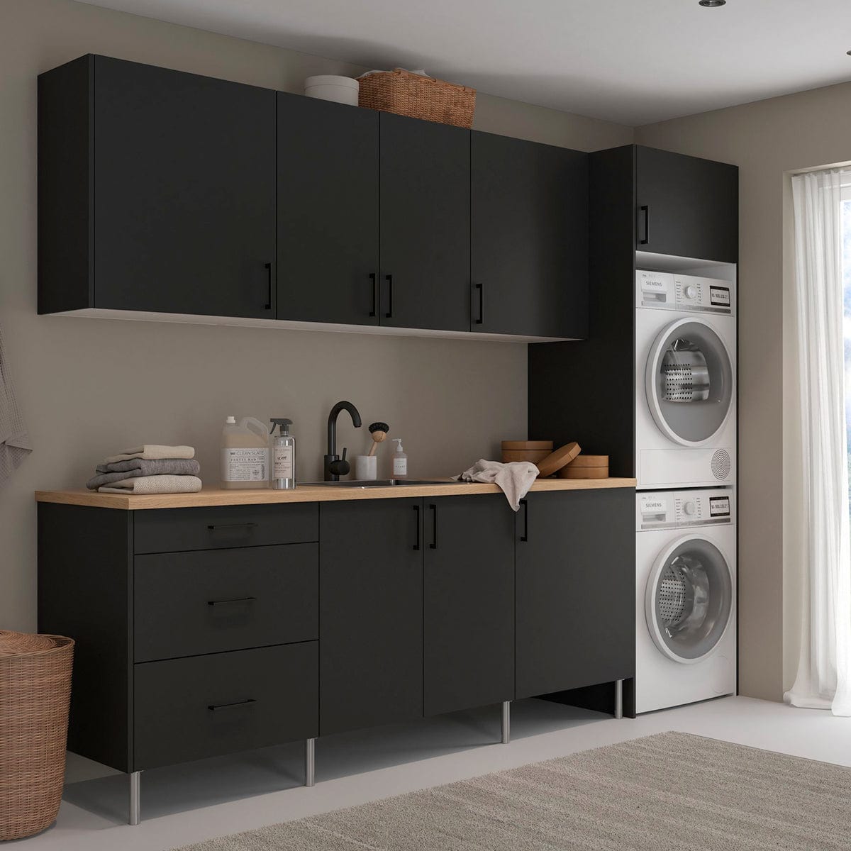 Du kan også kjøpe målsydde benkeplater uten endelister inntil 4,05 meter (priser per meter).bVær oppmerksom på at benkeplaten i eik og vaskeromsfronten i lys eik ikke har samme farge.