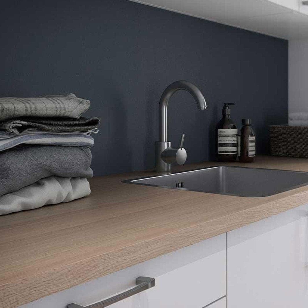 Linn Bad standard benkeplate med rett kant og endelist for vaskeromsinnredning i fargene matt hvit, skifer, lys betong og eik. Benkeplaten leveres i lengdene B60 - B80 - B120cm. Linn Bad benkeplater til vaskerom er produsert i høytrykkslaminert sponplate, er slitesterke og enkle å holde rene.