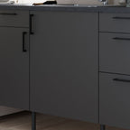 FRONTER, SKROTT OG DEKKSIDE Hvit er melaminbelagt 16 mm sponplate med ABS kantbånd. Sort/grå fronter og dekselsider er laget av 100 % resirkulert sponplate og PET-folie. PET består av resirkulert materiale fra blant annet plastflasker. Bruk av PET fremmer reduksjon av CO2-utslipp, og er et mer bærekraftig valg. Skrotten er 16 mm melaminbelagt sponplate. Håndtakene er i forkrommet stål.