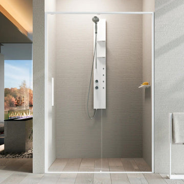 Med et minimalistisk design følger Riga-serien de nyeste interiørtrendene, hvor store glassflater og rene linjer dominerer. De elegante aluminiumsprofilene, utført med presise 45-graders skjøter, gir skyvedørene et sømløst og moderne preg. Solide profiler i aluminium sikrer både holdbarhet og pålitelighet i daglig bruk. Dusjveggen er også utstyrt med en styrebrakett mellom glassene, som du enkelt kan trykke ned for å frigjøre skyvedøren, slik at rengjøring og vedlikeholdsjobben skal være enklest mulig!